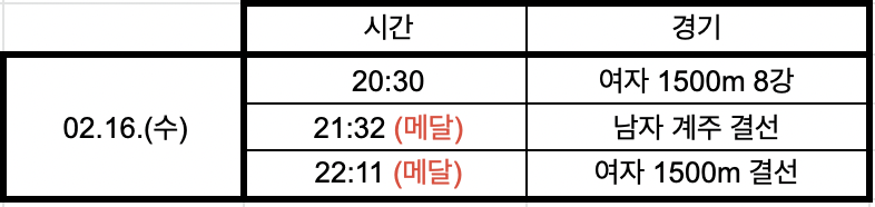 올림픽 쇼트트랙 일정 16일