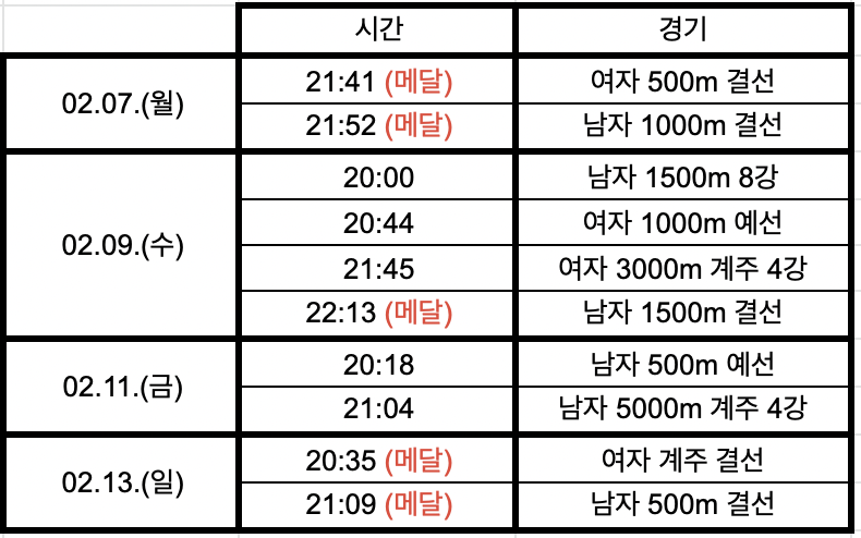 올림픽 쇼트트랙 일정 7일~13일